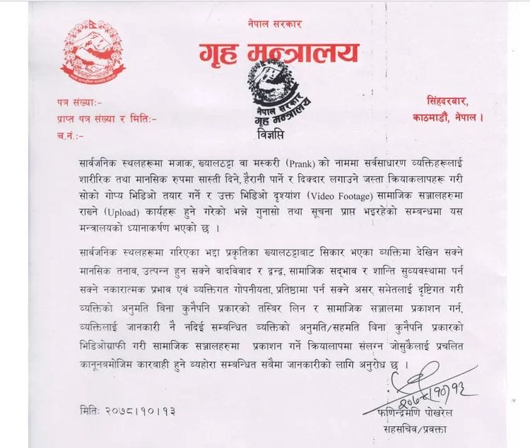यस्ता भद्दा प्रकृतिका ख्यालठटा गरि सर्वसाधारण लाई मानसिक तनाव उत्पन हुने, वादविवाद हुने,सामाजिक सदभाव र शान्ति सुब्यवस्तामा पर्न सक्ने नकारात्मक प्रभावलाई दृष्टिगत गरि बिना अनुमति कुनै पनि प्रकारको तस्बिर लिने र सामाजिक संजालमा प्रकासन गर्ने व्यक्तिलाई जानकारी नै नदिइ प्रकासन गर्ने लाई कानुनबमोजिम कारवाही हुने गृह मन्त्रालय का महासचिव फणिन्द्रमणि पोख्रेल ले बिज्ञप्ति जारी गराएका छन्।