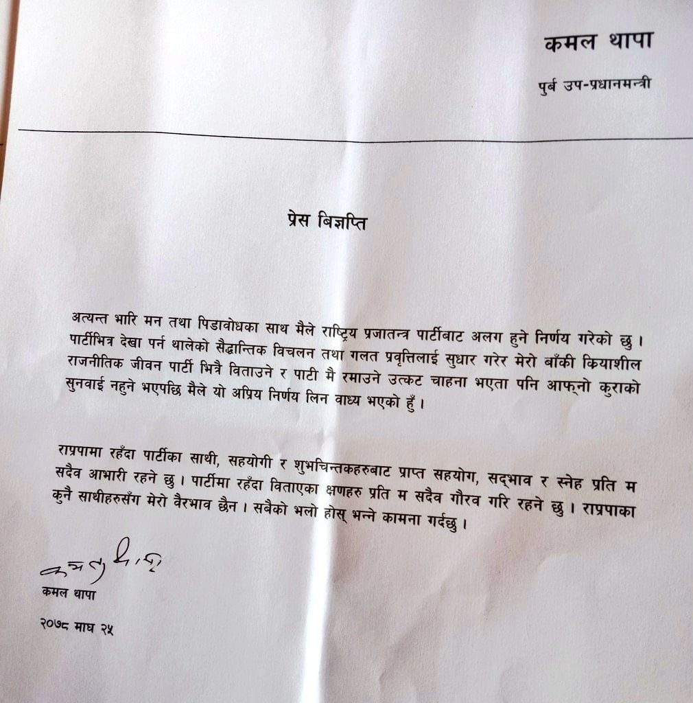 ‘राप्रपाकाे एकता महाधिवेशनपछि पार्टीकाे लाेकप्रियतामा वृद्धि तथा राष्ट्रिय शक्तिका रूपमा उदय र विकास भइरहेकाे समयमा निवर्तमान अध्यक्ष कमल थापाले पार्टीबाट अलग हुने भनी गरिएकाे घाेषणाप्रति दुःख प्रकट गर्दछाैँ । पार्टीबाट अलग हुने निर्णयमा पुनर्विचार गर्न राप्रपा अनुराेध गर्दछ’, विज्ञप्तिमा भनिएकाे छ ।