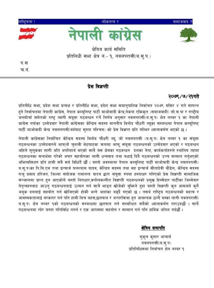 बिज्ञप्तीमा प्रदेश सभा र प्रतिनिधी सभाको उम्मेदवारका बिषयमा नेपाल कम्युनिष्ट पार्टी माओवादी केन्द्र नवलपरासी (ब.सु.प.) ले जारी गरेको बिज्ञप्तीले भ्रम सिर्जना गर्न खाजेको पनि कांग्रेसले जनाएको छ । – प्रेस विज्ञप्ती यसै सांथ संलग्न छ )