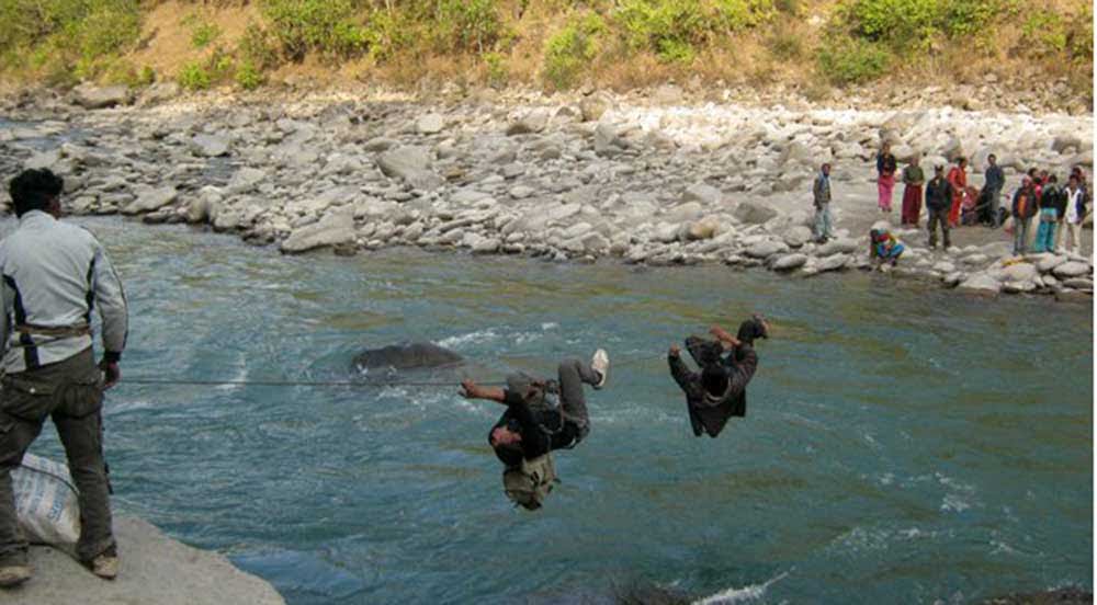 दार्चुलाको व्यास–२ मालघाटस्थित सीमा नदी महाकालीमा हालिएको तुइन । यो तुइन तर्दातर्दै गत साउन १५ मा भारतीय सुरक्षाकर्मीले लट्ठा खुस्काउँदा जयसिंह धामी नदीमा बेपत्ता भएका थिए । फाइल तस्बिर