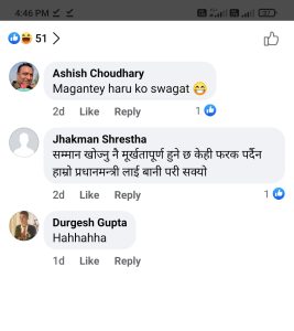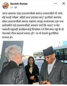 भारत भ्रमणमा जांदा प्रधानमन्त्रीको स्वागत राज्यमन्त्रीले गरे भनेर रोई कराई गर्नेहरू अहिले कता हराएका छन्? इटलीको भ्रमणमा रहेका प्रधानमन्त्रीको स्वागत त्यहांका परराष्ट्र मन्त्रालयका एक जना कर्मचारीले गर्दा प्रधानमन्त्रीको अपमान भयो कि भएन? म मेरा नक्कली राष्ट्रवादी साथीहरूलाई विश्लेषण गर्न निमन्त्रणा गर्छु के यो नेपालको गौरव बढाउने स्वागत हो? वा यो देशको कूटनीतिक मान्यता हो।