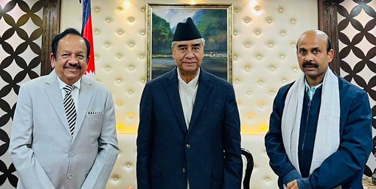काठमाडौं : प्रधानमन्त्री शेरबहादुर देउवा र भारतीय जनता पार्टी (भाजपा) का नर्ता पूर्वकेन्द्रीय मन्त्री डा. हर्षवर्द्धन र भाजपाका राष्ट्रीय सचिव हरिश द्विवेदीबीच शिष्टाचार भेटवार्ता भएको छ। नेकपा एमालेको १० औं महाधिवेशनको उद्घाटन सत्रमा सहभागी हुन नेपाल आएका नेताहरुले शुक्रबार प्रधानमन्त्री देउवसँग भेटघाट गरेको प्रधानमन्त्रीको सचिवालयले जनाएको छ।