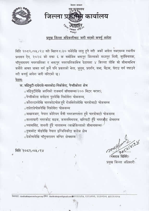 भक्तपुर– भक्तपुर जिल्ला प्रशासनले मंगलबार (भदौ २३) बिहानदेखि जिल्लाका विभिन्न क्षेत्रमा कर्फ्यु आदेश जारी गरेको छ। प्रमुख जिल्ला अधिकारी नमराज घिमिरेले जारी गरेको सूचनाअनुसार मध्यपुर थिमी, सूर्यविनायक, चाँगुनारायण र भक्तपुर नगरपालिकाभित्र कर्फ्यु लागू गरिएको हो।
