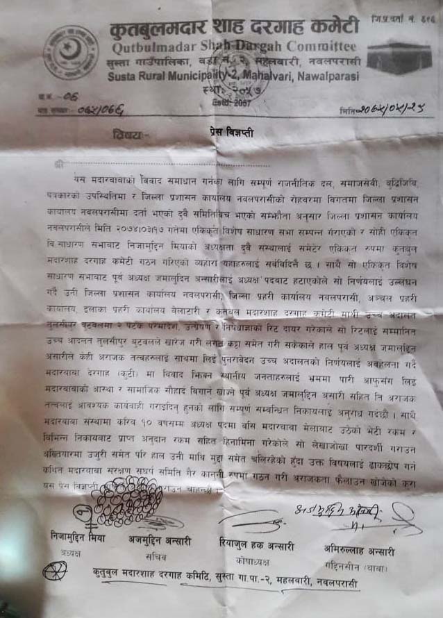 हिजो विहिवार पुर्व अध्यक्ष अंसारीले सो क्षेत्रका सोझासाझा जनताहरुलाई भ्रममा पारी परासी ल्याई बर्तमान कमेटीले लगाएको २०७४ सालमा मदार बाबा मेलाबाट उठेको भेटी रकमको लेखाजोखा माग्दै विरोध प्रदर्शन गर्दै जिल्ला प्रशासनमा ज्ञापन पत्र बुझाएका थिए । पुर्व अध्यक्ष अंसारीले बैधानिक बर्तमान कमेटीलाइ भाडन र मदारबाबा धार्मिक स्थल बदनाम गराउन स्थानिय जनतामा भ्रम छरिरहेको अंसारीलाई सम्बन्धित निकायद्धारा कार्वाहीको माग गरेको बर्तमान कमेटीका अध्यक्ष निजामुद्दिन मिँयाले बताए ।
