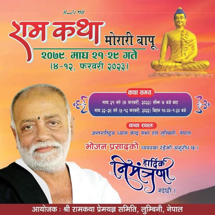 विभिन्न देशमा सञ्चालन हुदै आएकाे अन्तराष्ट्रिय स्तरकाे रामकथा नेपालकाे लुम्बिनीमा सन् २०२० मा नै सञ्चालन गर्ने तयारी गरिएकाे थियाे तर काेभिड संक्रमणका कारण स्थगित हुन पुगेकाे थियाे । सन् २०२० काे २ मे देखि १० मे सम्म सञ्चालन गर्ने भनिएकाे कार्यक्रम स्थगित गरिएपछि पुनः अहिले सञ्चालनकाे सम्पुर्ण तयारी पुरा गरिएकाे थियाे । नेपालमा पनि जनकपुर लगायत अन्य स्थानमा याे रामकथा सञ्चालन गरि सकिएकाे छ ।