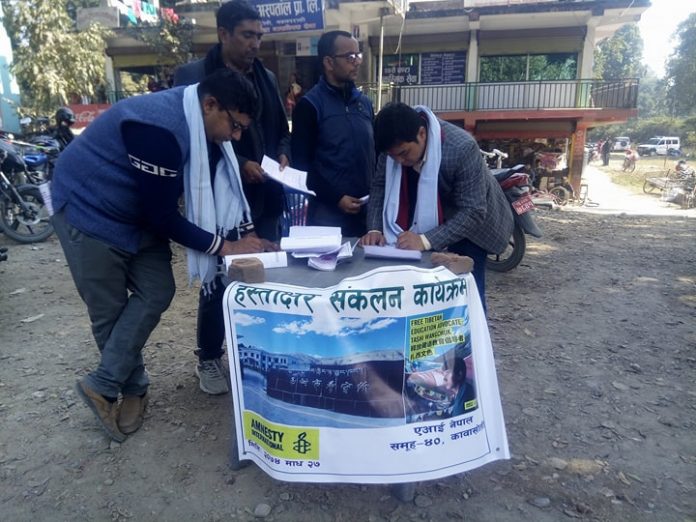 चिनियां मानवअधिकारकर्मी टाशी वांगचुकको रिहाई माग गर्दै मानवअधिकार क्षेत्रमा कृयाशिल अन्तराष्ट्रिय संस्था एम्नेस्टी ईन्टरनेशनल समुह ४० कावासोती शाखाले हस्ताक्षर संकलन गरेको छ ।