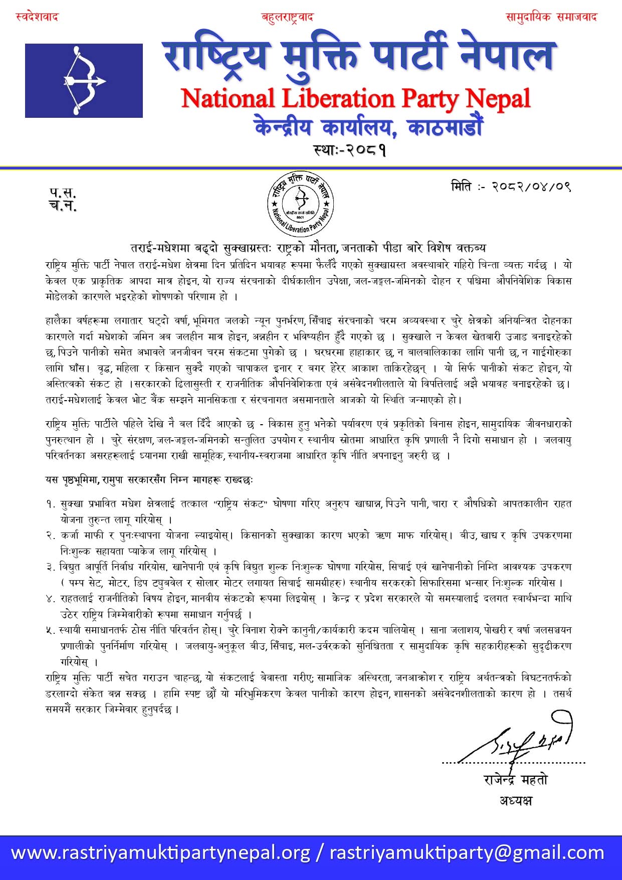 राष्ट्रिय मुक्ति पार्टीले तराई-मधेशमा भयावह रूपमा फैलँदै गएको सुक्खाग्रस्त अवस्थाप्रति गम्भीर चिन्ता व्यक्त गरेको छ। पार्टीका अनुसार यो केवल प्राकृतिक प्रकोप मात्र नभई राज्य संरचनाको दीर्घकालीन उपेक्षा र पश्चिमा विकास मोडेलको नाममा भएको जल-जंगल-जमिनको दोहनको परिणाम हो।