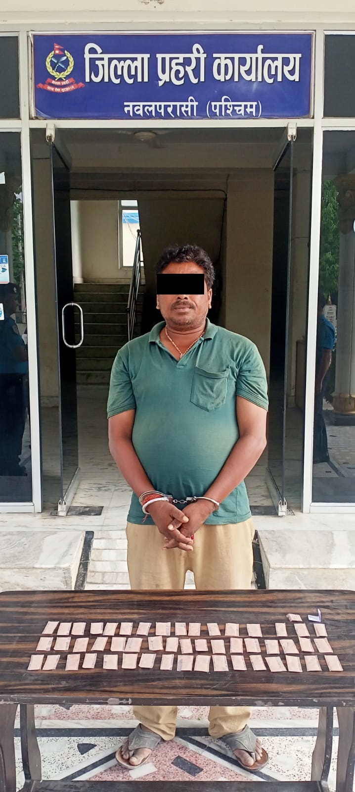 जिल्ला प्रहरी कार्यालय नवलपरासी र प्रहरी चौकी गेर्मीबाट खटिएको संयुक्त प्रहरी टोलीले जिल्ला नवलपरासी (ब.सु.प) रामग्राम नगरपालिका वडा नं.०९ कर्मैनी वस्ने वर्ष ४८ को सुरेन्द्र प्रसाद हरिजनले धर्मशालाको खाटमा रहेको विस्तारा मुनी लुकाई छिपाई राखेको अवस्थामा लागु औषध खैरो हिरोईन जस्तो देखिने धुलो पदार्थ ५० पुडिया (नेट तौल ४६.३८० ग्राम) फेला पारी रितपूर्वक बरामद गरी उक्त लागू औषध सहित निज सुरेन्द्र प्रसाद हरिजनलाई तत्काल पक्राउ गरी जिल्ला प्रहरी कार्यालय नवलपरासी (ब.सु.प.) मा ल्याई प्रहरी हिरासतमा राखी थप अनुसन्धान भईरहेको प्रहरीले जनाएकाे छ ।
