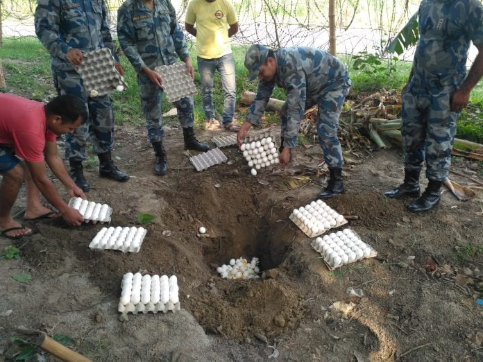 प्रहरीले चेकजाँच गर्ने क्रममा तस्करहरु अण्डा छोडेर भागेकाे प्रहरी निरिक्षक तेजबहादुर बुढाथाेकीले बताउनु भयाे। नियन्त्रणमा लिइएकाे साे अण्डा आज स्थानियबासिन्दा, पत्रकार, सुरक्षाकर्मी तथा महेशपुरका पशु क्वारेनटाईन चेक पाेस्टका अधिक्रित खडग बहादुर सिंहको राेहबरमा नष्ट गरिएकाे छ । जिल्लाकाे पकलिहवा, गुठिप्रसाैनी, बसहिया, भुजहवा, महेशपुर र गेर्मी लगायतका नाकाबाट भारतीय कुखुराकाे अण्डा नेपाल भित्रिदै आएकाे स्राेतकाे दाबी छ ।