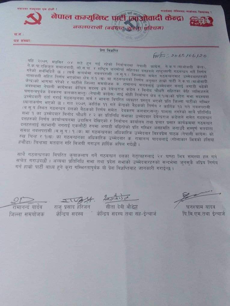 बिज्ञप्तीमा प्रदेश सभा र प्रतिनिधी सभाको उम्मेदवारका बिषयमा नेपाल कम्युनिष्ट पार्टी माओवादी केन्द्र नवलपरासी (ब.सु.प.) ले जारी गरेको बिज्ञप्तीले भ्रम सिर्जना गर्न खाजेको पनि कांग्रेसले जनाएको छ । – प्रेस विज्ञप्ती यसै सांथ संलग्न छ )