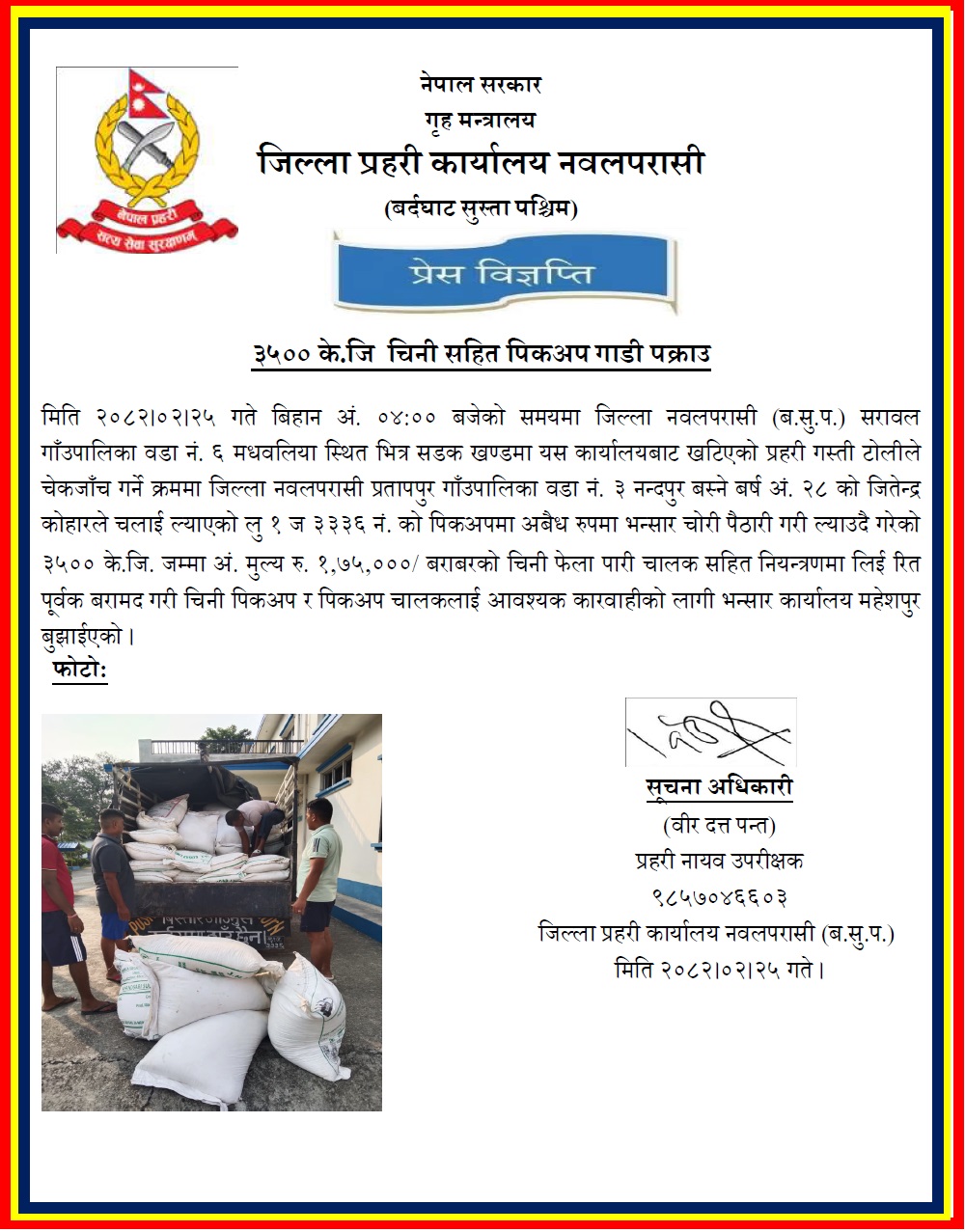 नवलपरासी । जिल्ला प्रहरीले १ लाख ७५ हजार मूल्य पर्ने ३५ क्विन्टल चिनी बरामद गरि कार्वाही चलाएकाे छ ।