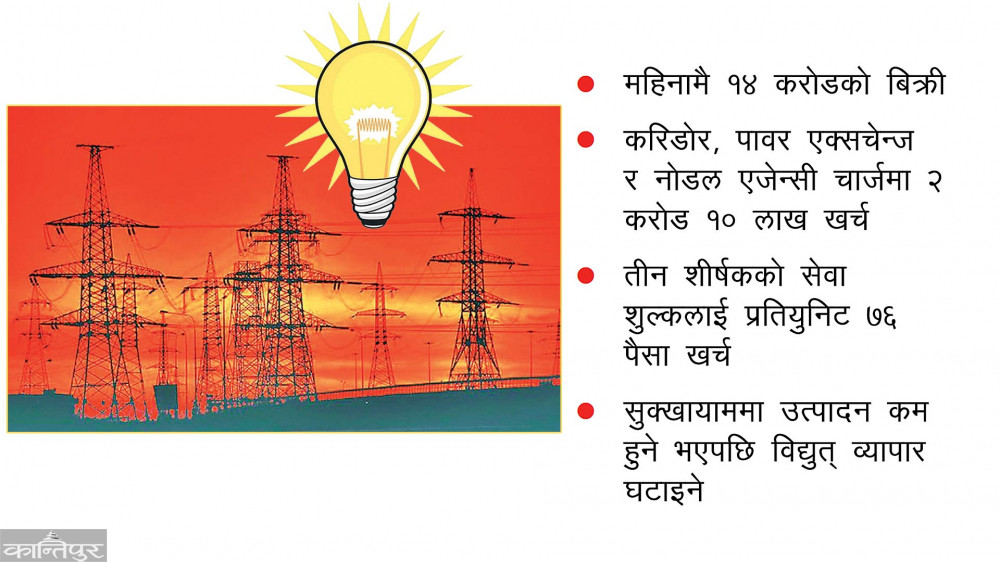 पावर एक्सचेन्ज चार्जका रूपमा प्राधिकरणले ८ लाख ९८ हजार ५६० रुपैयाँ इन्डियन इनर्जी एक्सचेन्ज (आईईएक्स) लाई तिरेको छ । भारतीय बजारमा विद्युत् बेच्न बोलकबोल (अक्सन) प्रक्रियामा सहभागी हुने प्लेटफर्मका रूपमा आईईएक्स छ । प्राधिकरणले भारतमा सोझै बिजुली बेच्ने नभई भारतीय मध्यस्थकर्ता कम्पनी एनटीपीसी विद्युत् व्यापार निगम लिमिटेड (एनभीभीएन) मार्फत जाने गरेको छ । हरेक दिन अक्सन प्रक्रियामा भाग लिने, भारतीय बजारमा बेचिने बिजुलीको मूल्य प्रस्ताव गर्ने र बिक्री भएको विद्युत् भुक्तानी लिनेसम्मको काम एनभीभीएनले गर्छ । नोडल एजेन्सी तथा मध्यस्थकर्ताका रूपमा काम गरेबापत एनभीभीएनले प्राधिकरणबाट ७ लाख ८६ हजार रुपैयाँ लगेको छ । यसरी तीन शीर्षकमा तिरिएको सेवाशुल्क रकम प्राधिकरणले १ महिना अवधिमा गरेको कुल विद्युत् व्यापारको १७ दशमलव ८३ प्रतिशत बराबर हो ।कान्तिपुरबाट