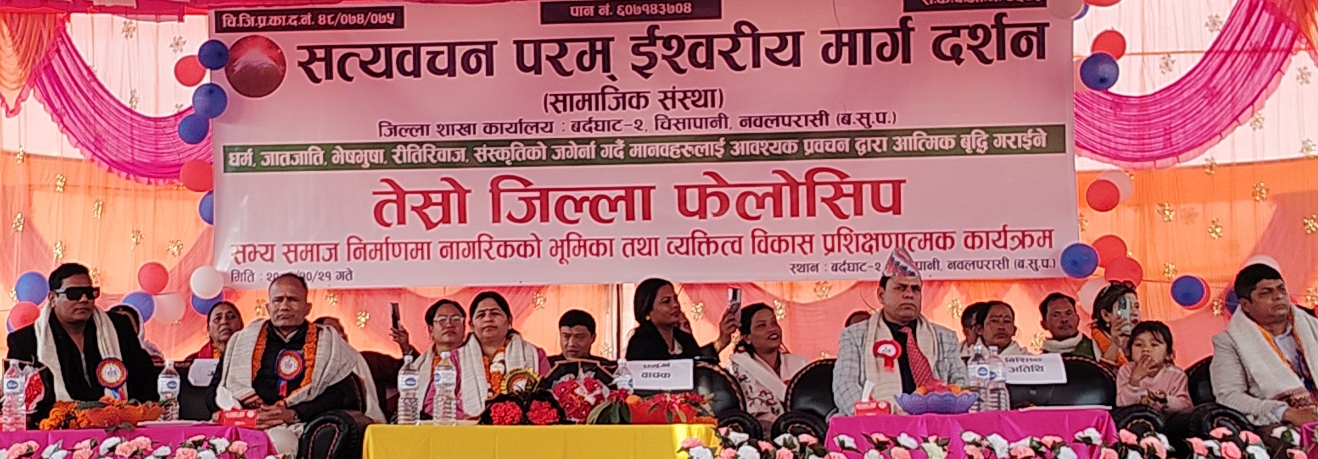 सत्यवचन परम् ईश्वरीय मार्ग दर्शन (सामाजिक संस्था) जिल्ला शाखा कार्यालय बर्दघाट–२, चिसापानी, पश्चिम नवलपरासीको आयोजनामा तेस्रो जिल्ला फेलोसिप तथा व्यक्तित्व विकाससम्बन्धी एक दिने प्रशिक्षणात्मक कार्यक्रम सम्पन्न भएको छ।