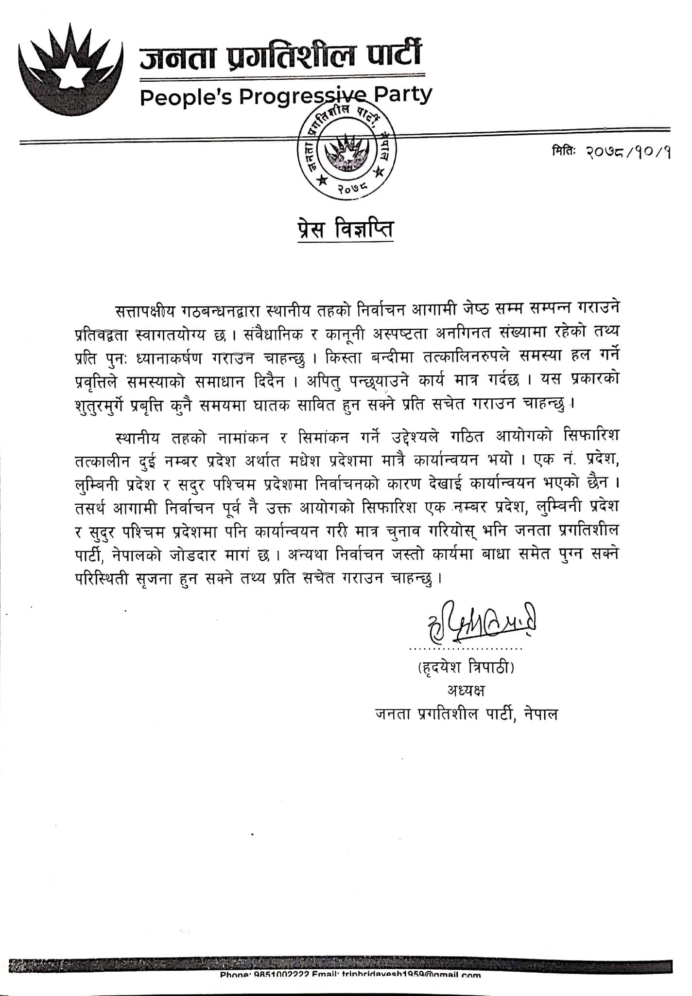 त्यसो नगरिए ‘निर्वाचनजस्तो कार्यमा बाधासमेत पुग्न सक्ने परिस्थिति सिर्जना हुनसक्ने तथ्यप्रति सचेत गराउन चाहन्छु,’ जनता प्रगतिशील पार्टीका अध्यक्ष हृदयेश त्रिपाठीद्वारा हास्ताक्षरित विज्ञप्तिमा उल्लेख छ ।